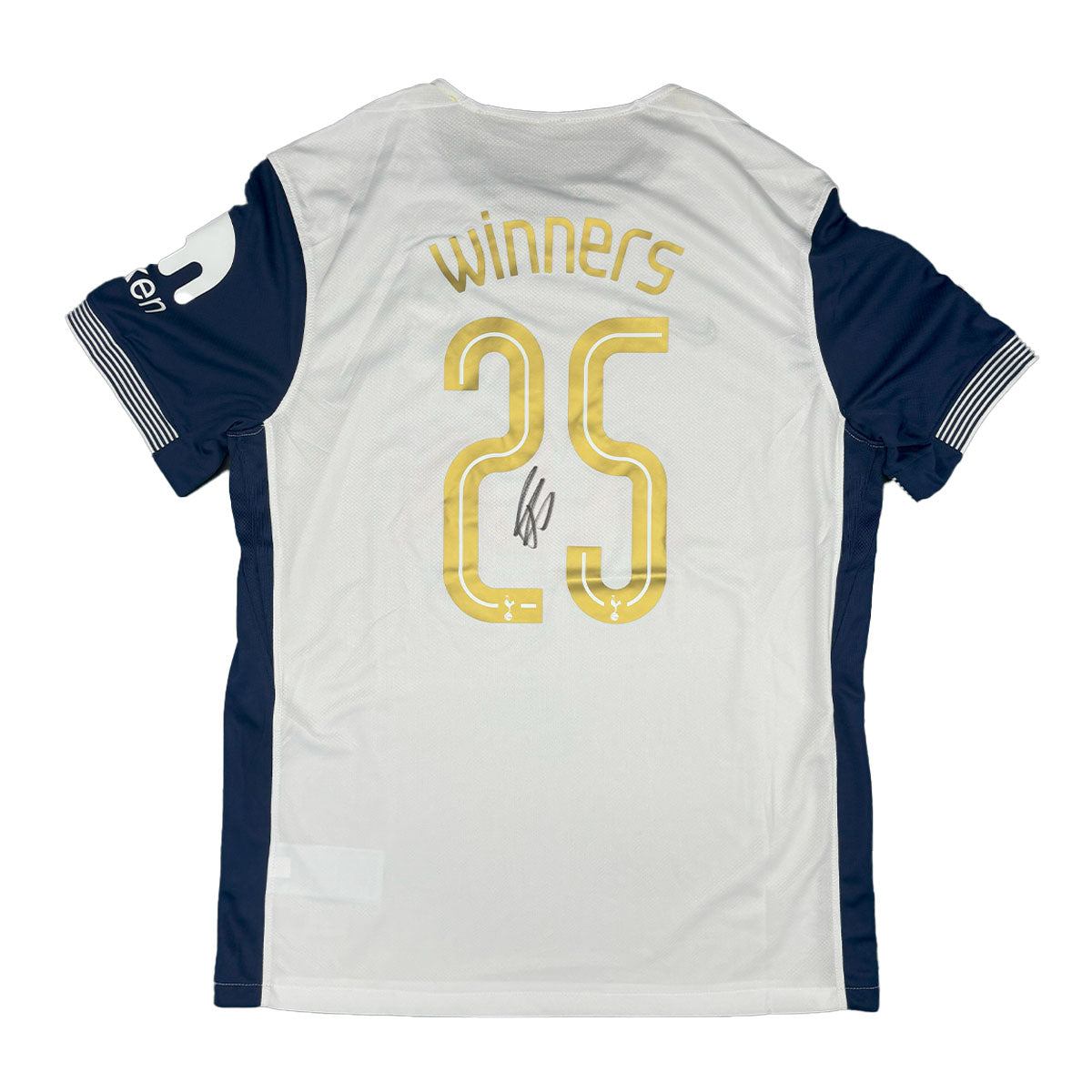 This Tottenham Hotspur ' Winners 25' 2024/2025 Home Shirt was signed by Brennan Johnson.